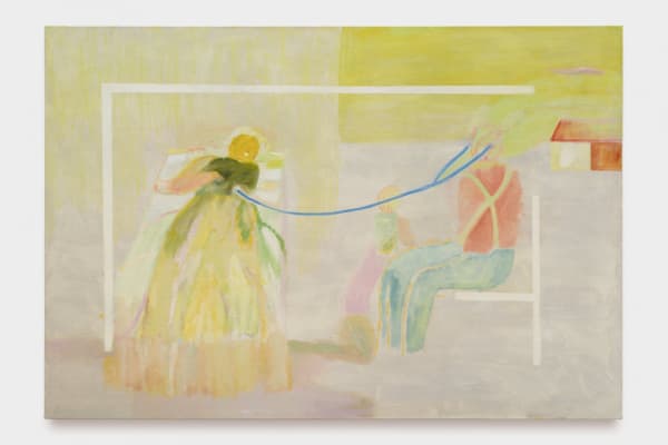 Utilising a distinct, almost uneasy palette, her paintings, some imposing in scale, others quietly intimate, explore power relations between people and their environments; the charging or depletion of resources experienced within daily life spent in an urban city system. Pale greens, whites and yellows infuse select canvases with the luminous quality of artificial halogen bulbs, of street lamps and train carriages, refracted through hazy, geometric interiors that imply the doubling effect of windows or mirrors.