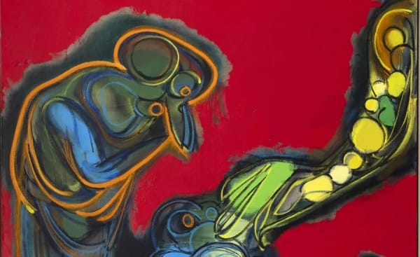 Starting 2015, Richter began to narrow the scope of his focus to the human form, with a new unmistakable approach that abandoned the vastness of previous scenes in favor of more direct compositions. In these paintings, the compression and tension between figures expresses a range of dynamics, proposing powerful intersubjective experiences through the convergence of forms. The interplay of strongly defined silhouettes and the subtle gradations of each background creates a balance between abstraction and figuration. The tension played out in Richter’s large-scale compositions is elevated by the colors and forms he uses and lends the works a ludic quality.